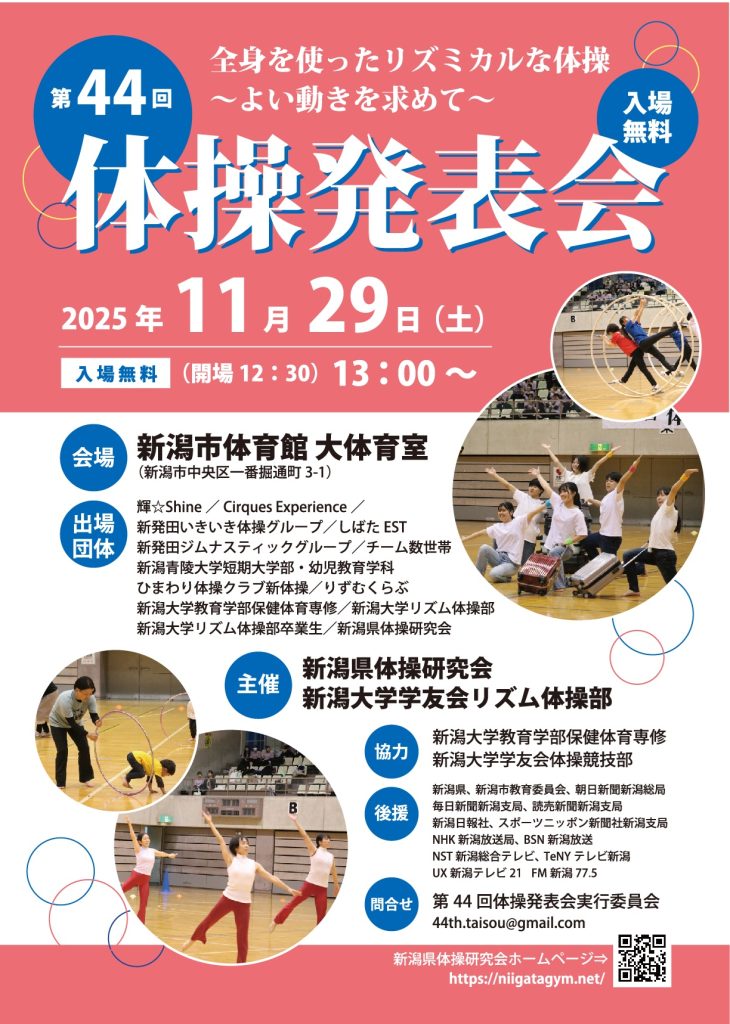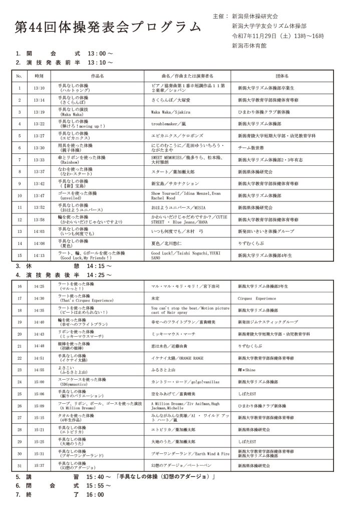 第44回体操発表会プログラム 2025年11月9日 ブログ 23 Views 令和7年11月29日(土)に体操発表会が行われます。詳細は以下のとおりです。 ぜひ皆様、新潟市体育館へお越しください! 定例練習会Ⅱ変更のお知らせ